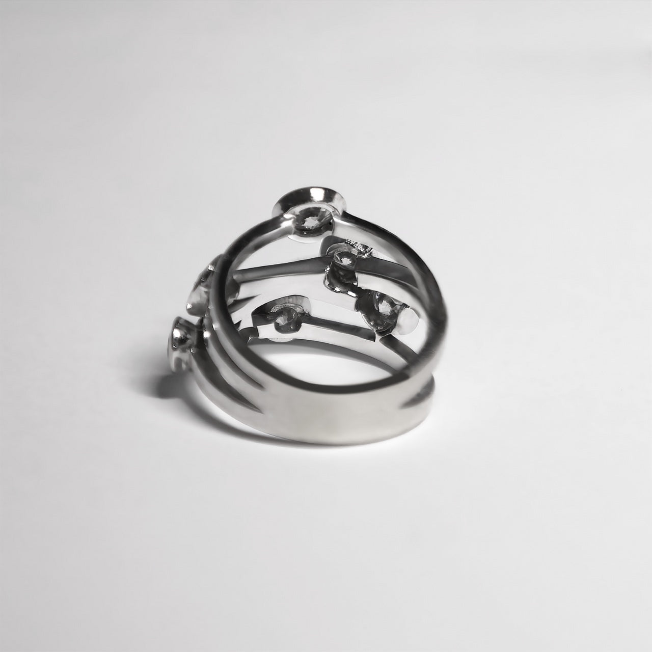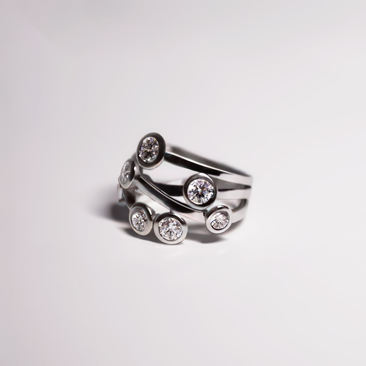 Embrace the beauty of this stunning custom-made 18K white gold "bubble" ring, designed to celebrate your individuality. Seven natural round brilliant diamonds in E/F colour and VS2 clarity are thoughtfully arranged in a charming bubble pattern that catches light beautifully from every direction by distributing light across multiple faceted surfaces, maximizing brilliance and fire. This architectural approach to diamond placement distinguishes the piece from conventional solitaire designs, offering collectors a refined alternative that balances technical precision with contemporary aesthetics.