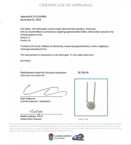 Add some sparkle to your outfit with and experience the elegance of this 1.00 ct. TW, Natural Round Brilliant Diamond Halo Pendant with 17" Chain. Expertly crafted in 14K White Gold, this custom-made halo pendant is the perfect accessory for any occasion. Its dazzling centerpiece is a 0.78 ct. natural round brilliant diamond, surrounded by 14 matching natural round brilliant diamonds, totaling 0.21 ct., in a "halo" setting. With a 17 inch, 14K White Gold Chain included, this pendant offers both luxury and versatility.