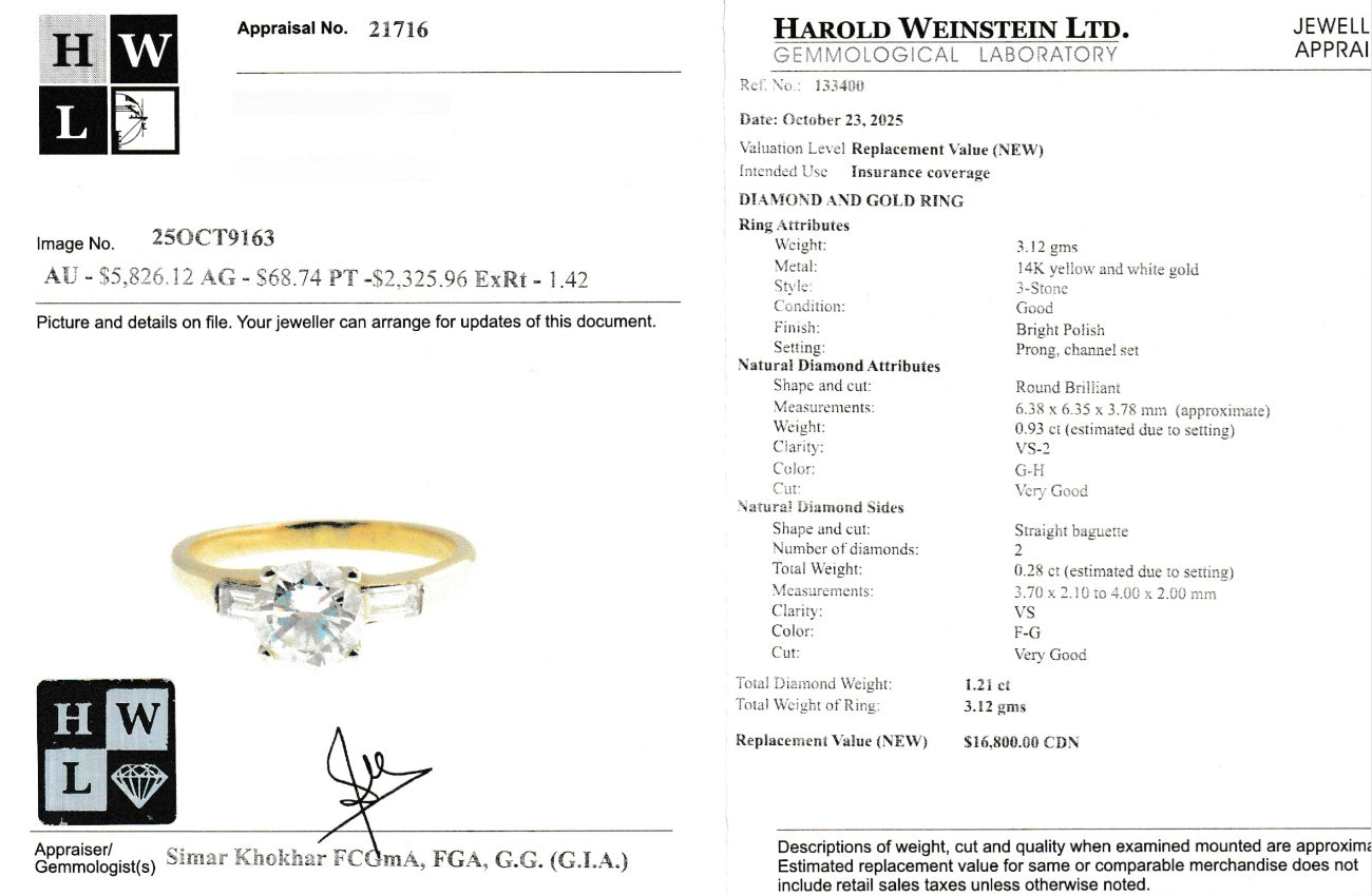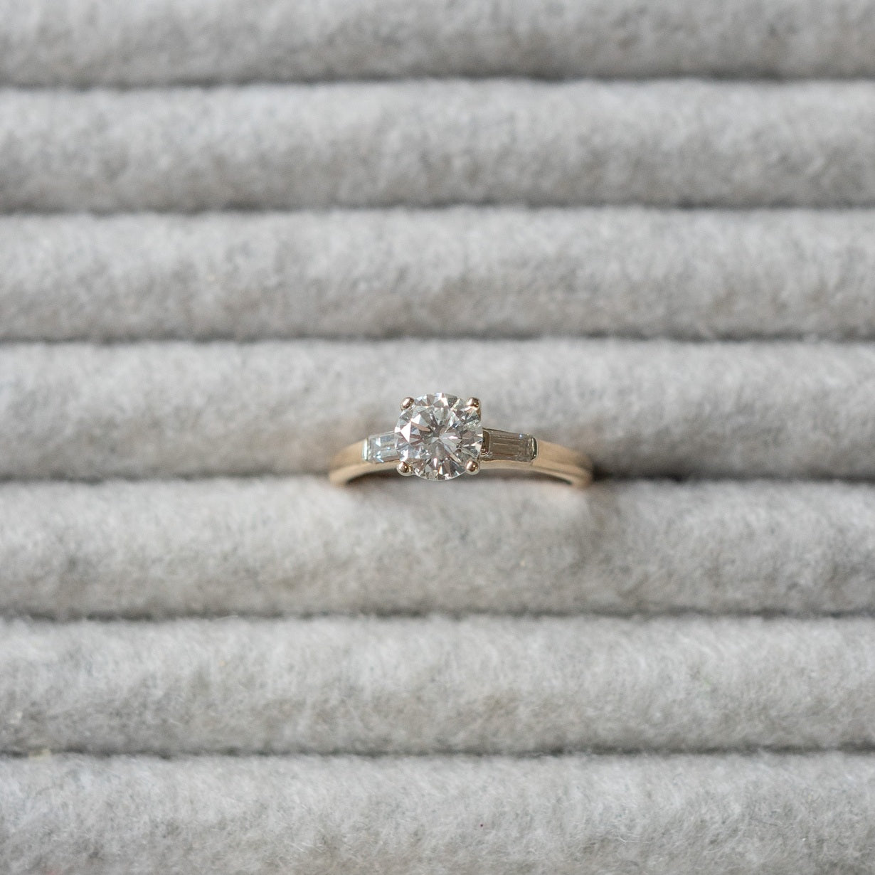 Celebrate your special moments with this exquisite 3-Stone Diamond Ring that represents timeless elegance and refined taste. The centerpiece showcases a gorgeous 0.93 carat round brilliant diamond with G/H colour and VS2 clarity, complemented by two matching, precisely cut 0.28 carat straight baguette diamonds on either side, creating a harmonious and balanced design that flatters any skin tone and complements various styles. Each diamond is carefully selected for their very good cut quality, ensuring they work together to create stunning brilliance and exceptional light performance.