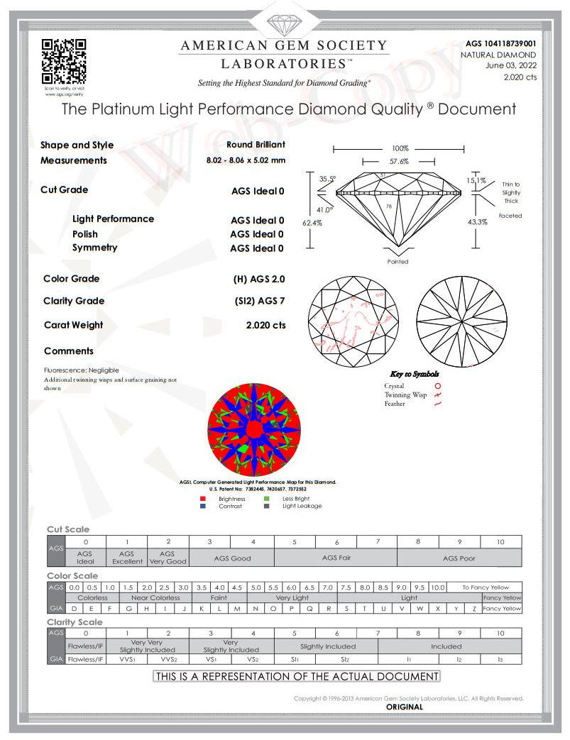 For customers wanting in-depth information about the cut quality and light performance of their diamond, the AGS report provides cut analysis that's very comprehensive. However, in our experience; AGS clarity grades can be inconsistent, particularly in the SI1 / SI2 range, and our Diamond & Jewellery Experts have observed AGS certified "SI2" clarity diamonds that were more equivalent to I1 clarity diamonds, when compared to GIA clarity grades. Therefore, we advise caution when considering AGS certified diamonds in the SI1 / SI2 range.