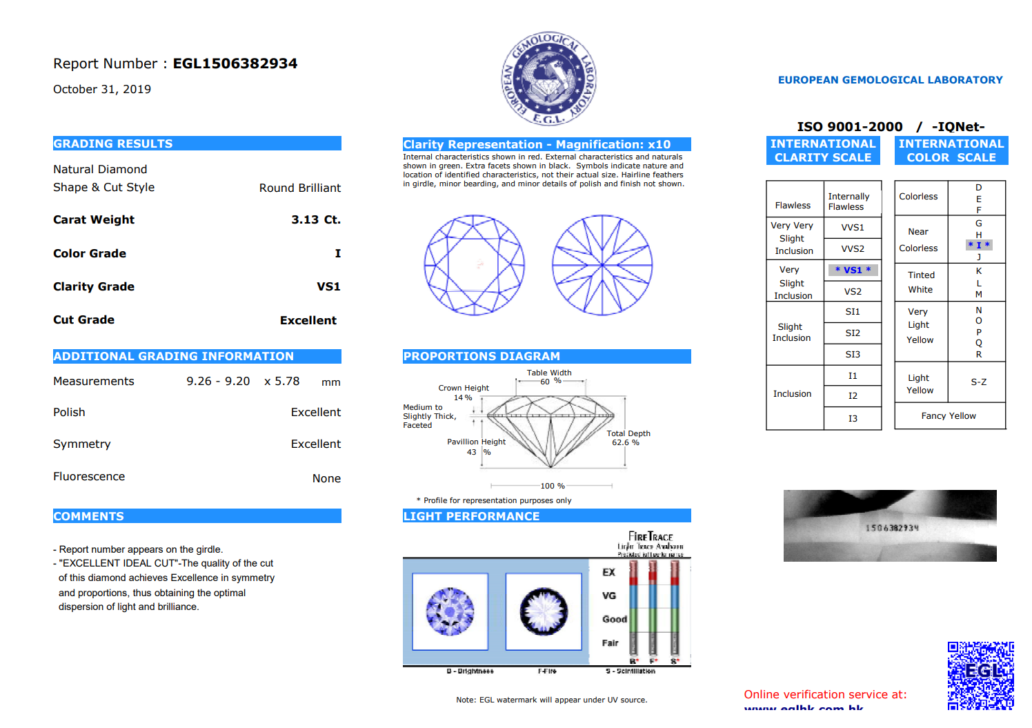 EGL is one of the four largest gemological laboratories in the world, however; EGL certified Diamonds are less expensive than equivalent GIA, IGI and AGS diamonds, because EGL's color grading standard is not as strict. For example, if you compare the color of an EGL graded diamond with an equivalent GIA certified diamond, the EGL diamond will be on average 2 grades lower on the GIA color grading scale. Meaning, if you're considering an EGL graded "G" color diamond, you should expect it to look like an "I" color compared to a GIA certified diamond, however it will still be classified as “near-colorless”. In our experience, EGL's clarity grading standard is very similar to GIA, but it's not uncommon for there to be a difference in opinion of one clarity grade, even between the best gem-labs. Major international gem-labs like GIA, IGI, AGS and EGL will essentially agree on the carat weight, measurements and physical proportions of a diamond, and although EGL is not as strict at grading color as GIA, IGI and AGS, our Diamond & Jewellery experts have observed that EGL grades are the equivalent or better than the grading standard of diamonds seen at most jewellery stores who provide their own “in-house” grades. In an independent study where the same 10 diamonds were sent to 6 major gem-labs to assess the quality and consistency of their grades, overall they found EGL USA to be the 3rd strictest in their grading standards, behind GIA and IGI.